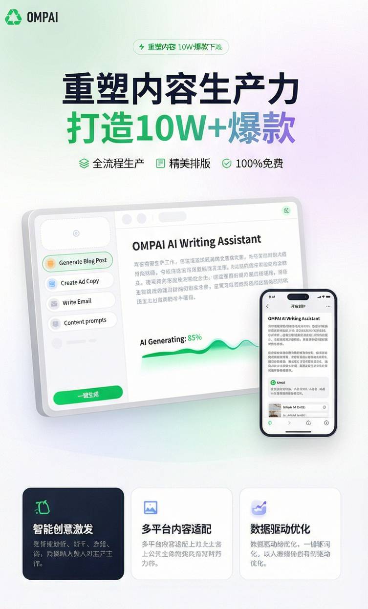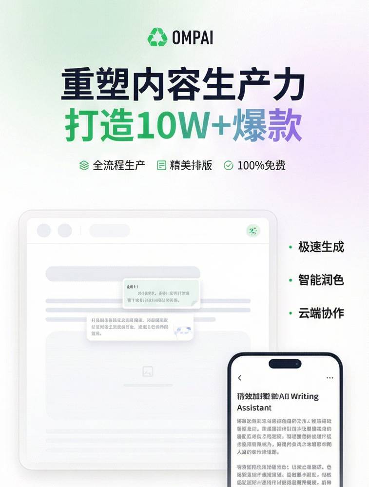 公众号内容创作将变得非常简单。ompai是一款打通从选题到排版的公众号智能助手。使用ompai进行公众号内容创作,你可以轻松找到好的内容标题,轻松打造漂亮的排版风格。无需为自己的创意枯竭而烦恼,一切都有帮手。